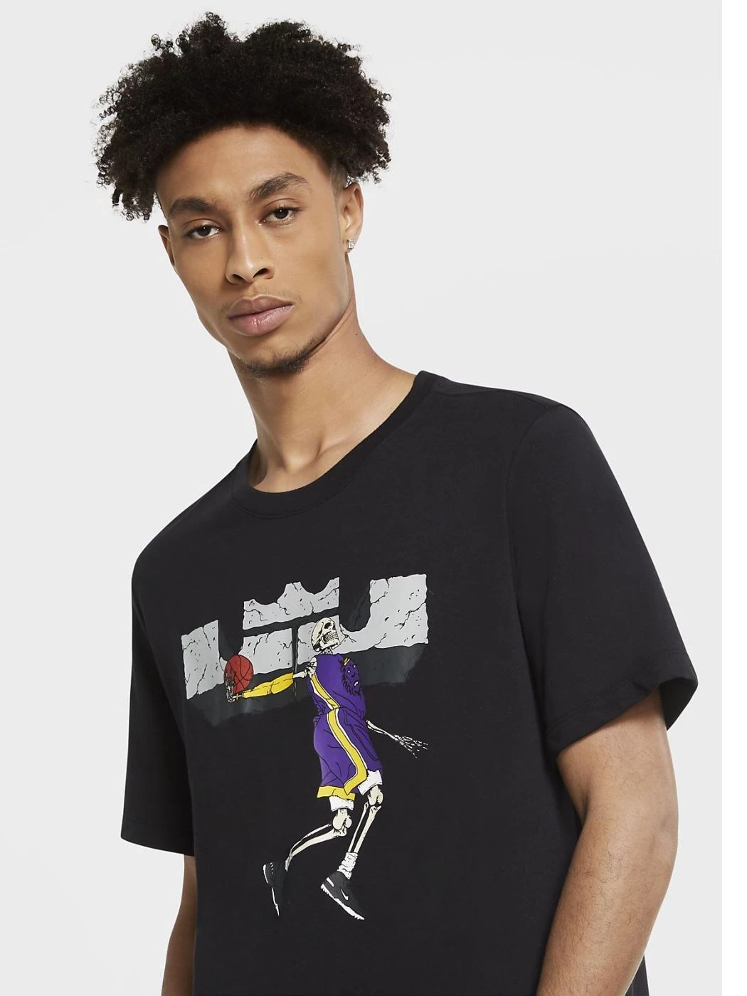 cod. CV1048 La t-shirt Nike Dri-FIT LeBron Logo immagina il Re come uno scheletro in volo, impegnato in una schiacciata mostruosa, con il monumentale logo della corona sullo sfondo.