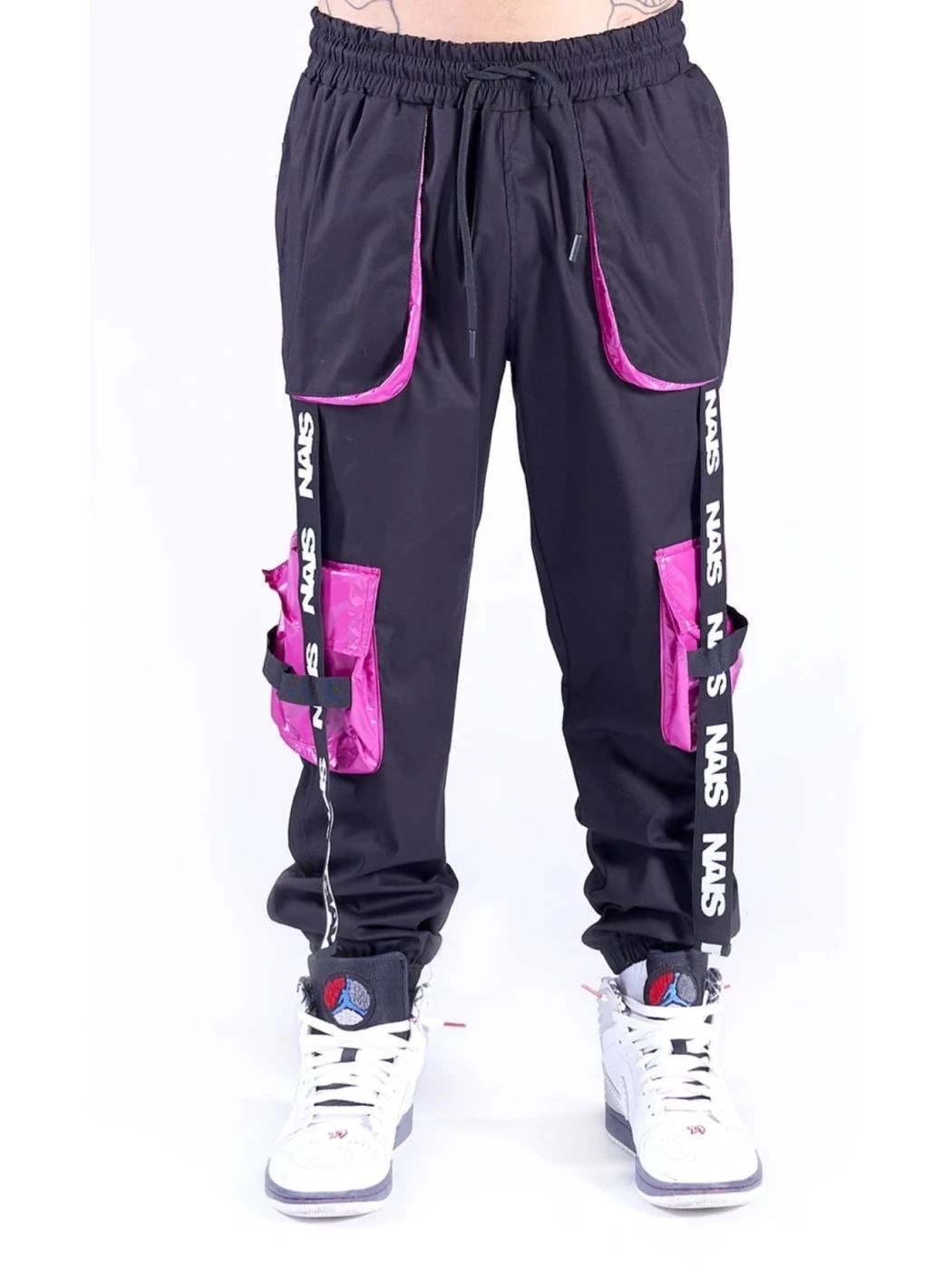 cod. NAPT93-2-1 Cargo Nais Design, il modello presenta due tasche laterali sui fianchi e due tasche sulle ginocchia, elastico in vita regolabile da coulisse, nastri logati che scendono lungo la gamba e elastico nelle caviglie.