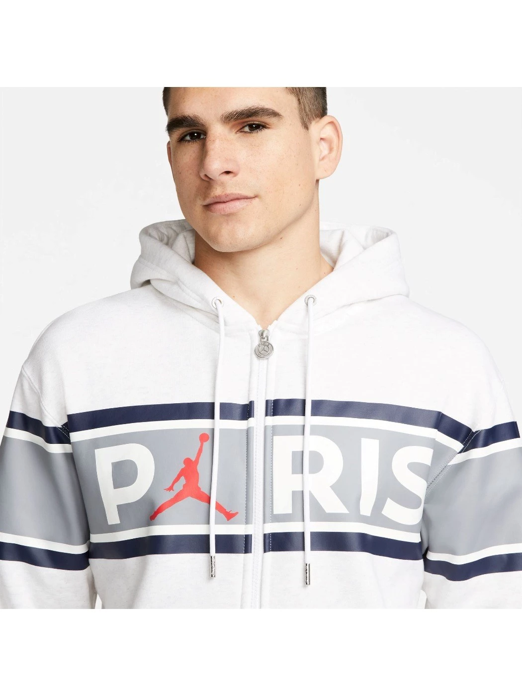 Gli occhielli e le punte del cordoncino e i tiretti delle cerniere sono marchiati con i loghi Jordan x Paris Saint-Germain. Stemma del club, targhetta dell'atleta, stampa e dettagli ricamati segnalano audacemente la collaborazione.