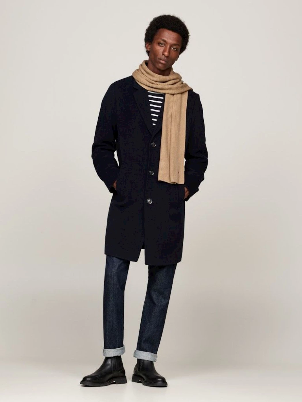 cod. M12847 Modello: Sciarpa · Materiale: Cotone e cashmere · Dettagli: Texture a coste all over, bandierina Tommy Hilfiger ricamata all'estremità · Dimensioni: 25 x 180 cm · Composizione: 95% cotone, 5% cashmere
