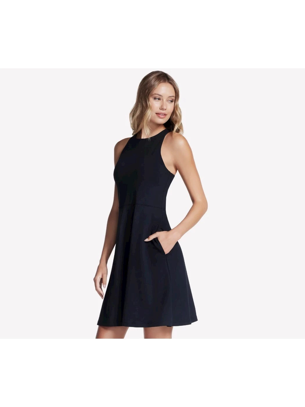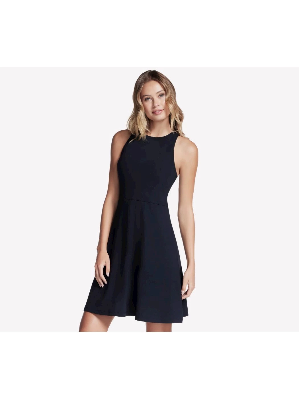 Casual comfort and sporty detail combine in a feminine silhouette with Skechers GO WALK(TM) Everyday Dress. This thigh-length dress is made from our soft and stretchyGO FLEX(TM) blended fabric with a racer back, on seam hand pockets, and a built in shelf bra with removable Skechers Air-Cooled Memory Foam® cups.