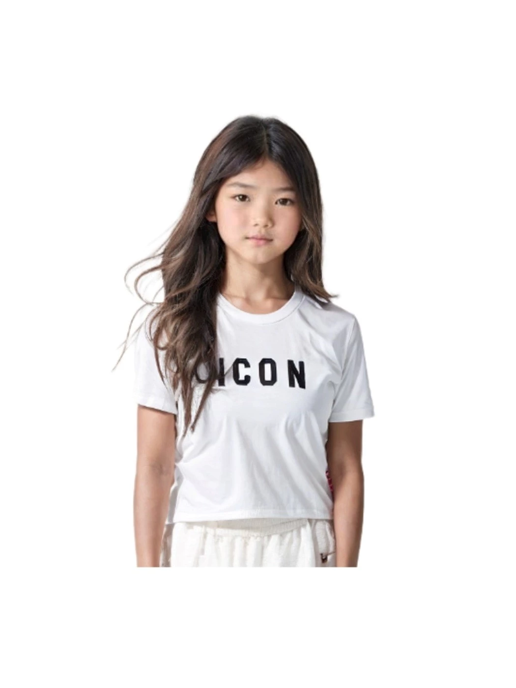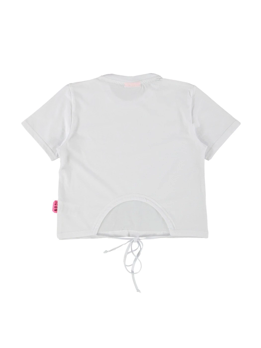 cod. IGKS00538 T-shirt ragazza Icon, in cotone, mezza manica, modello corpped, allacciata dietro, stampa in glitter sul petto