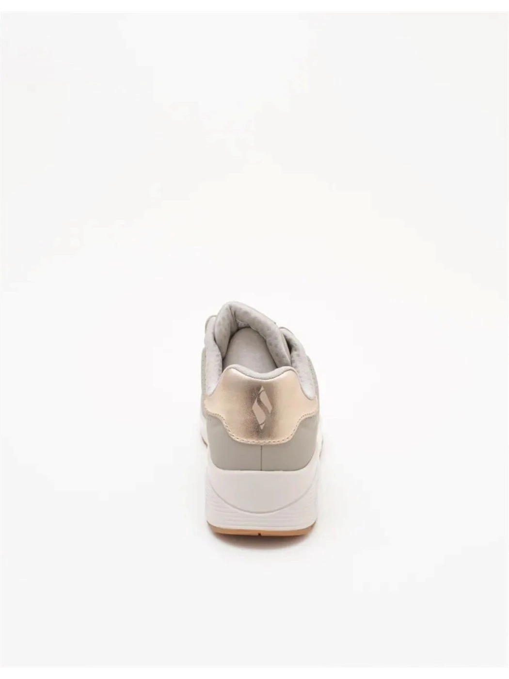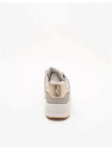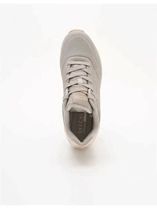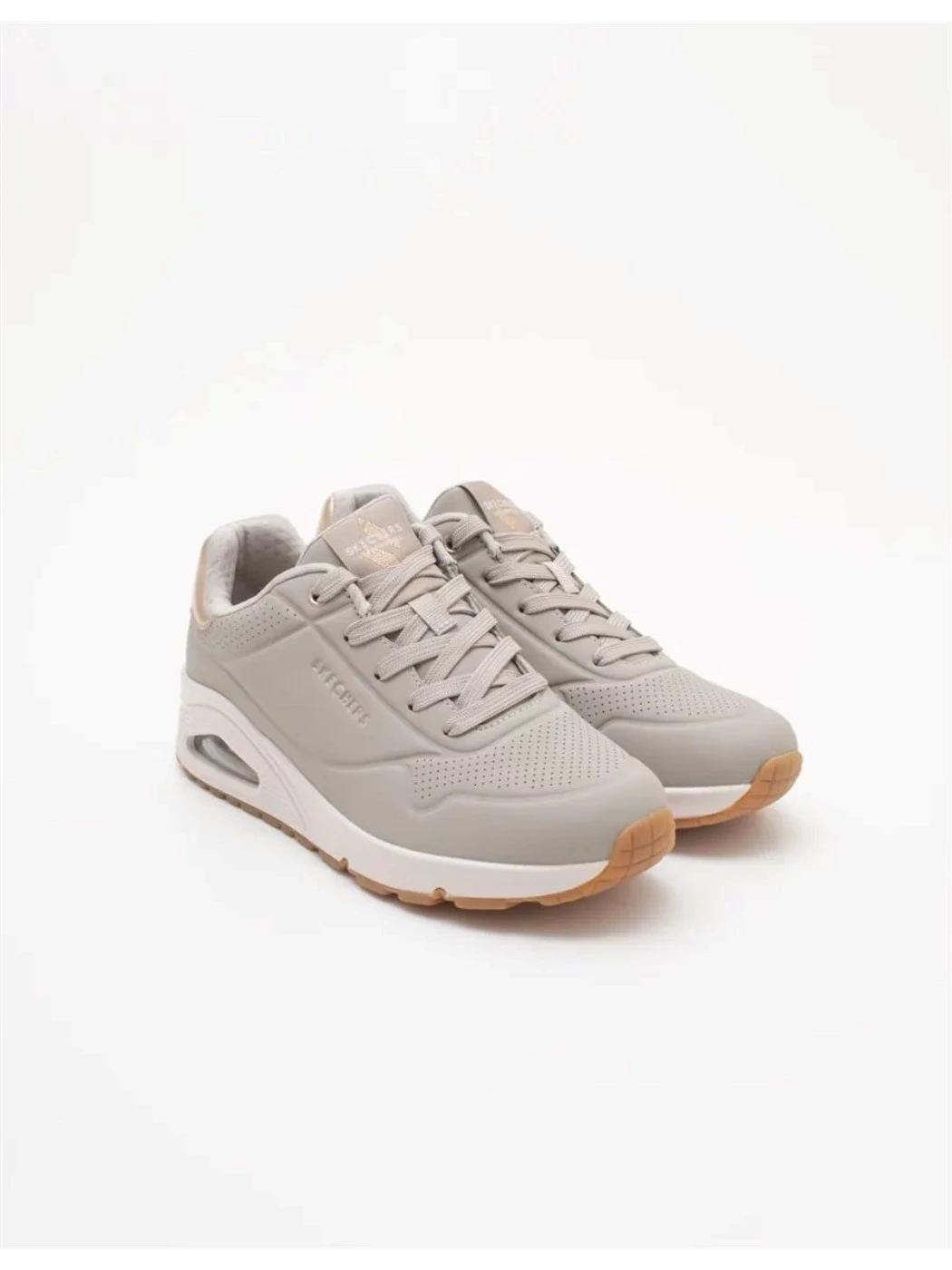 Sneaker da donna colore taupe. Questa sneaker allacciata di tendenza presenta una tomaia in durabuck tecnico traforata. Una comoda soletta Skechers Air Cooled Memory Foam® e un'intersuola ammortizzata ad aria con tecnologia visibile Skech-Air®. Dettaglio gold sul tallone. Tomaia in ecopelle, interno in tessuto e suola in gomma.
