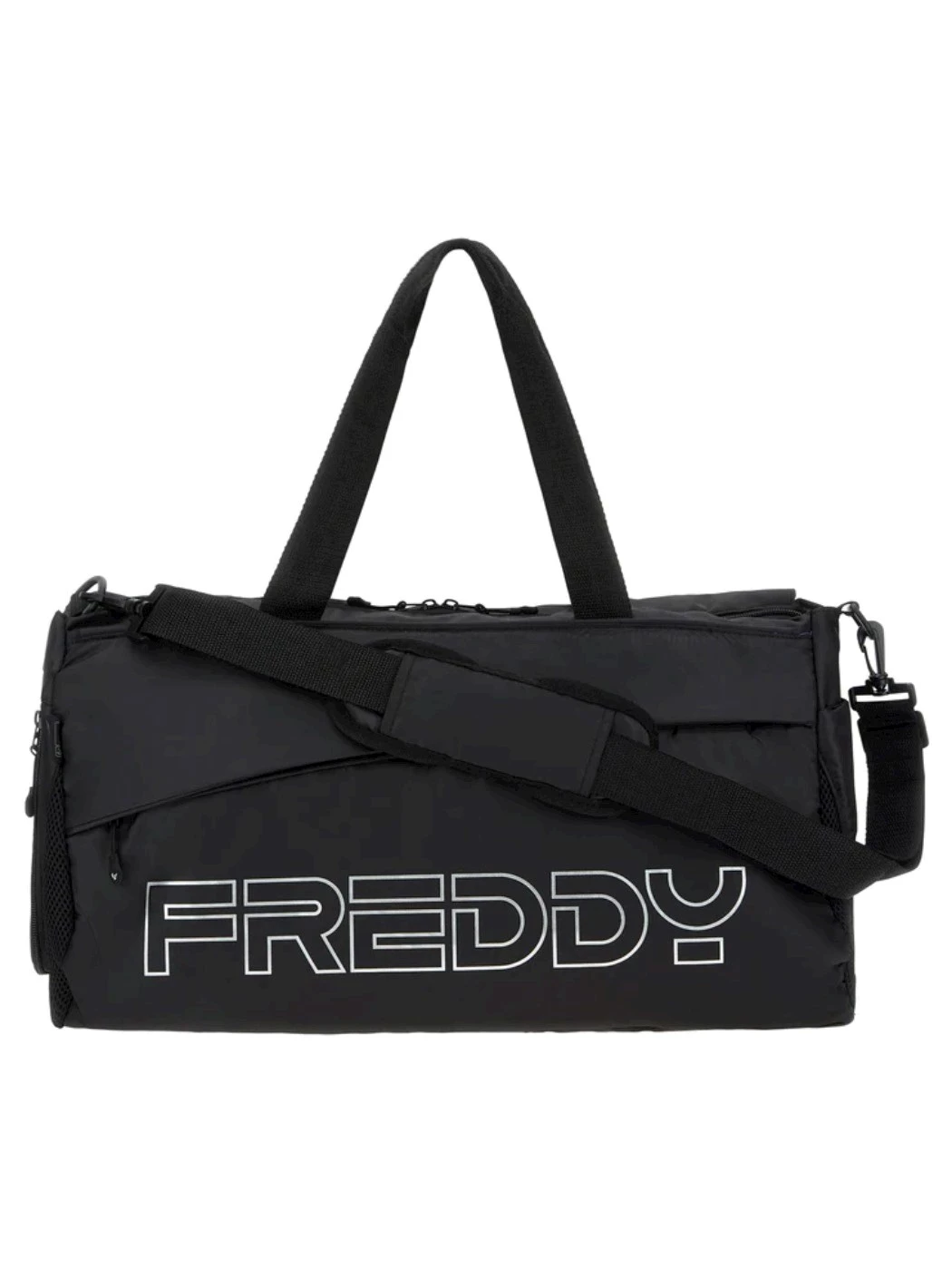 Borsone da palestra in nylon nero con grande stampa FREDDY in outline argento a contrasto colore. La chiusura principale è a zip con doppio cursore, le tasche laterali hanno inserti in rete di mesh per riporre i capi umidi separatamente dal resto del contenuto, inoltre dispone di una comoda tasca esterna su tutta la lunghezza dotata di chiusura a zip. Dispone di doppi manici e tracolla regolabile che si può staccare dotata di rinforzo morbido sulla spalla.