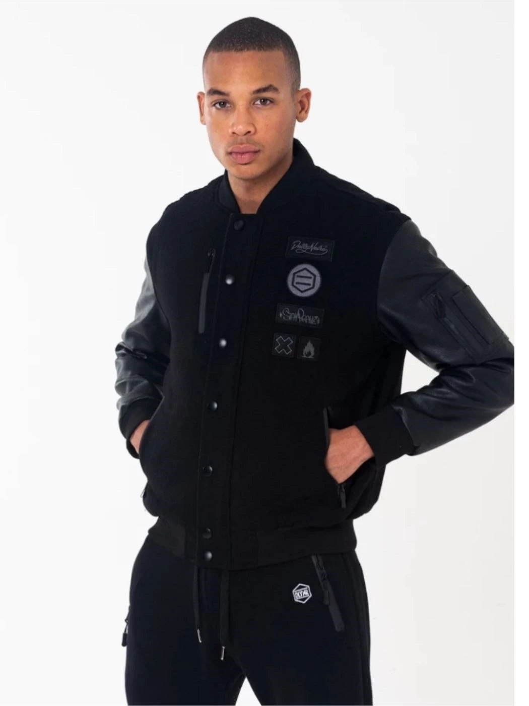 Varsity bomber con maniche in ecopelle e corpo in lana nera