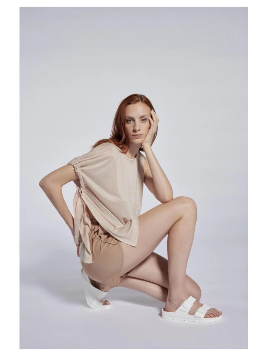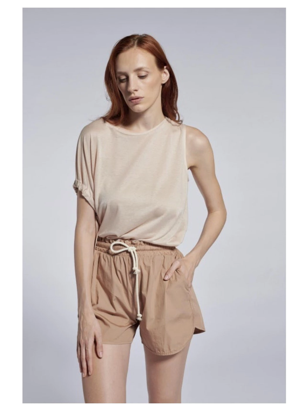 cod. D63413 girocollo - smanicata - arricciatura sul fianco destro con apertura laterale tinto in capo con prodotti ecosostenibili la modella è alta 177 e indossa taglia M
