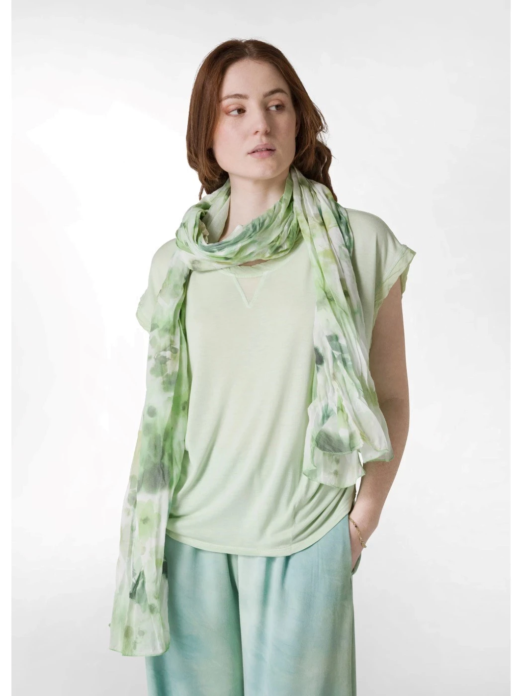 Una fantasia originale sviluppata all'interno del nostro reparto creativo in Italia impreziosisce il foulard per un look femminile e distintivo.