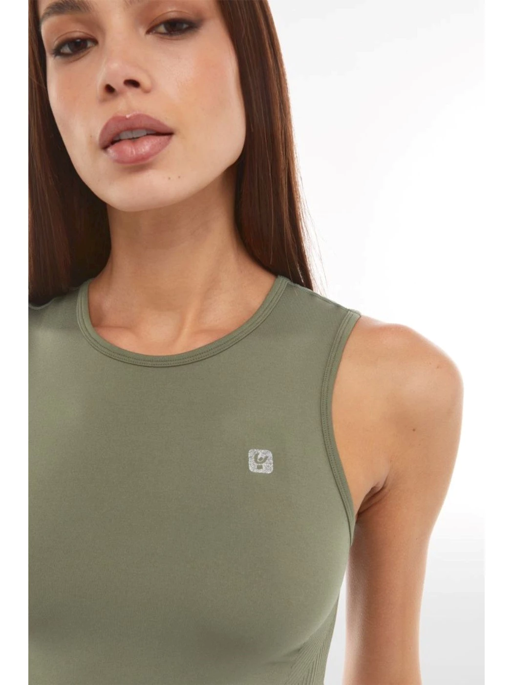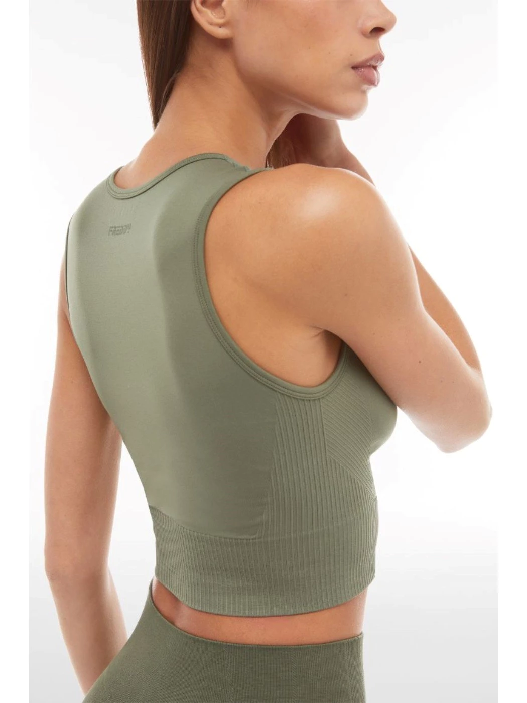 Top corto in vita senza maniche realizzato in poliammide elasticizzato, un tessuto ecosostenibile ottenuto per il 60% da materiali riciclati.