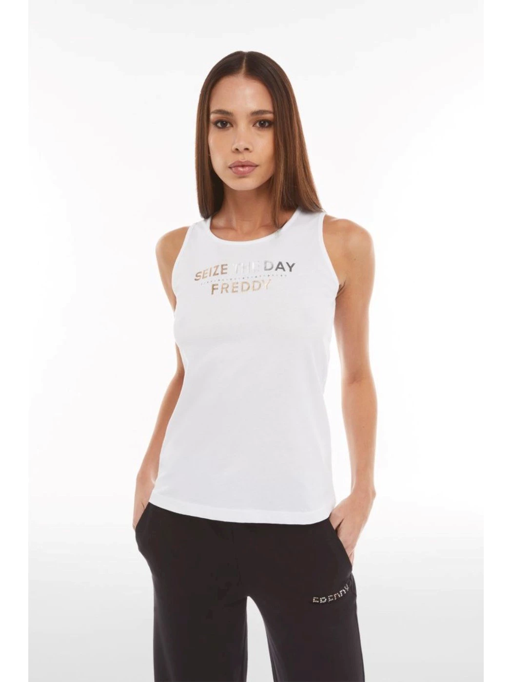 Il design classico di questa canotta da donna si unisce alla naturale morbidezza del tessuto jersey in 100% cotone nel seguire morbidamente le forme del corpo donando ampiezza di movimento e comodità. Le borchie metallizzate che decorano lo slogan SEIZE THE DAY stampato sempre ad effetto metallizzato donano un tono glamour all'insieme.