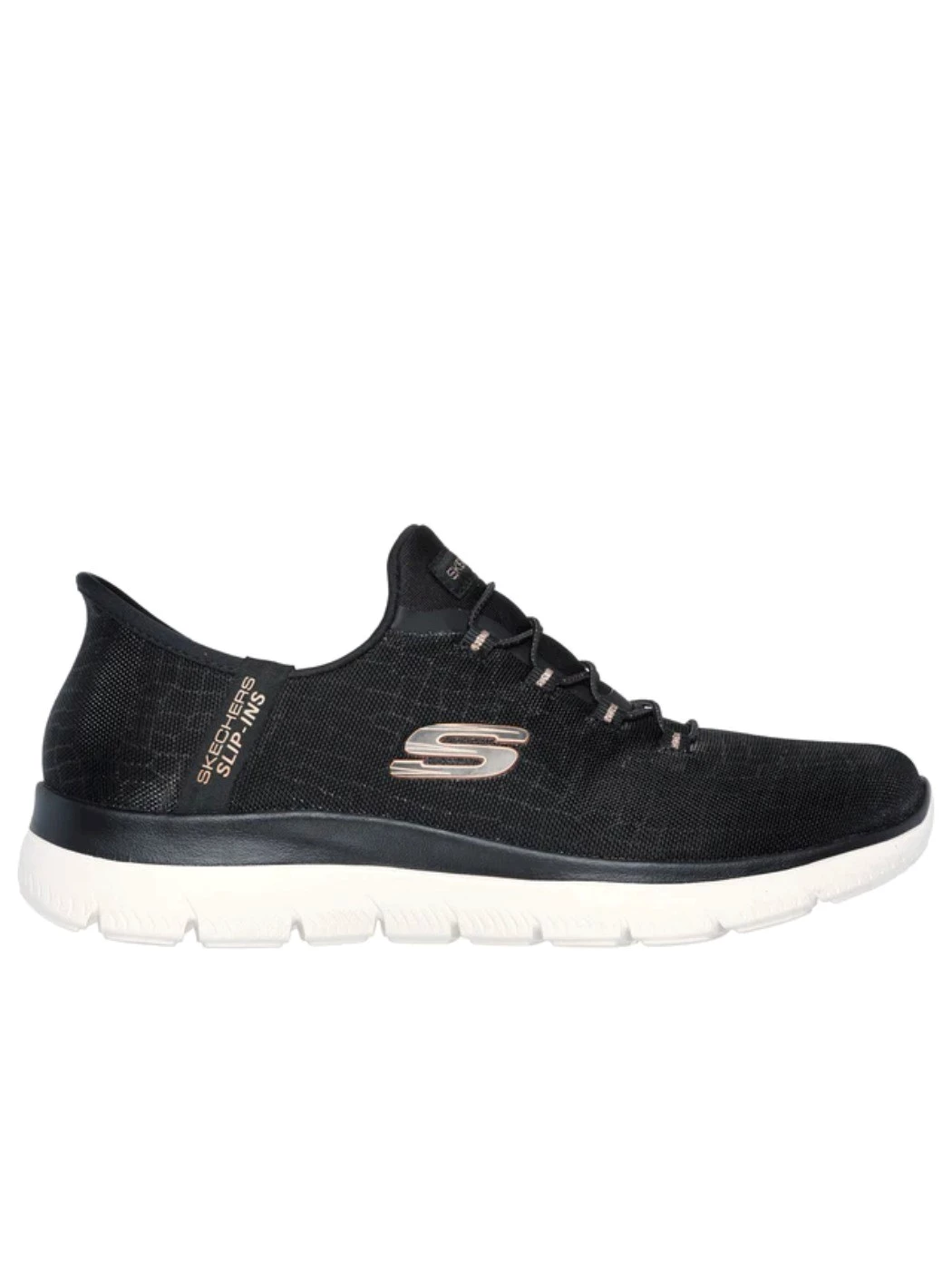 Add a little glamour to your step with the effortlessly comfortable Skechers Slip-ins® : Summits - Classy Night. Designed with our exclusive Heel Pillow(TM), this vegan style features a glittering snake-pattern mesh upper with fixed stretch laces and a comfortable Skechers Air-Cooled Memory Foam® insole.