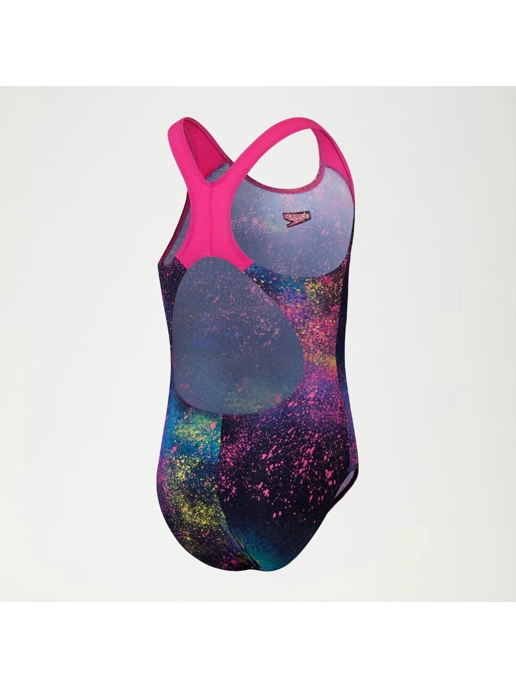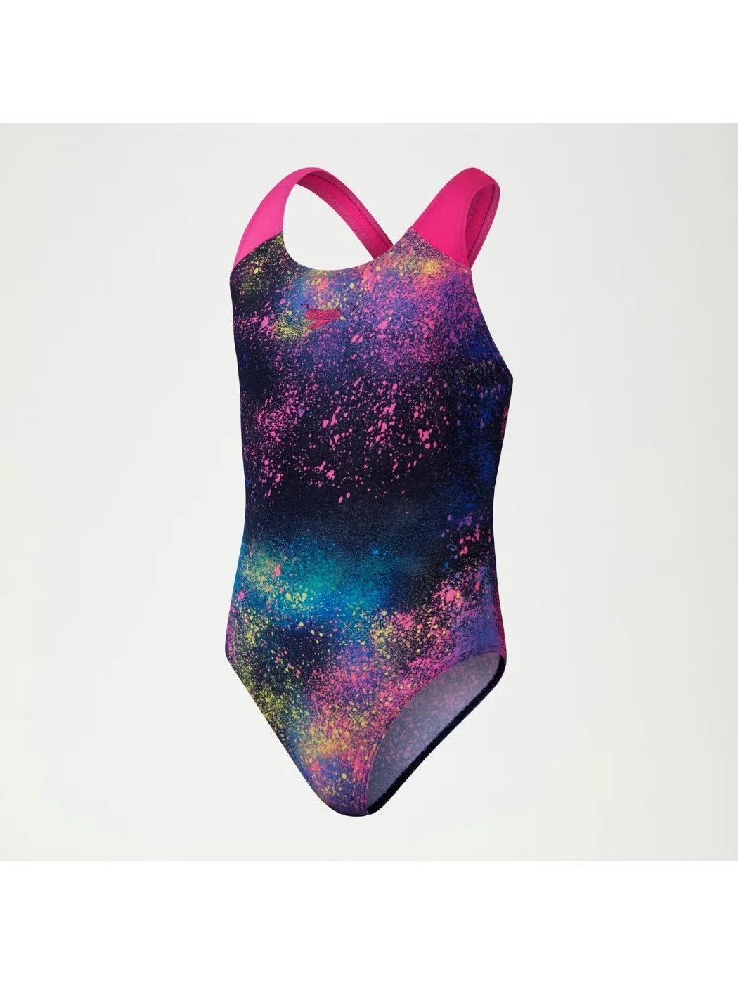 Affronta allenamenti spaziali indossando il nostro accattivante costume da bagno Splashback rosa e nero con un'ipnotizzante stampa celestiale. Il modello Splashback è dotato di spalline posizionate lontano dalle spalle per aumentare la libertà di movimento, consentendo alle giovani nuotatrici di allenarsi senza sentirsi limitate. Ideale per le lezioni e gli allenamenti, il costume da bagno è foderato sul davanti per comfort e copertura. Realizzato con il nostro tessuto resistente Endurance+, ad asciugatura rapida e 100% resistente al cloro. Inoltre, il filato in poliestere del tessuto Endurance+ è ricavato al 100% da rifiuti post-consumo, come le bottiglie in plastica riciclate.