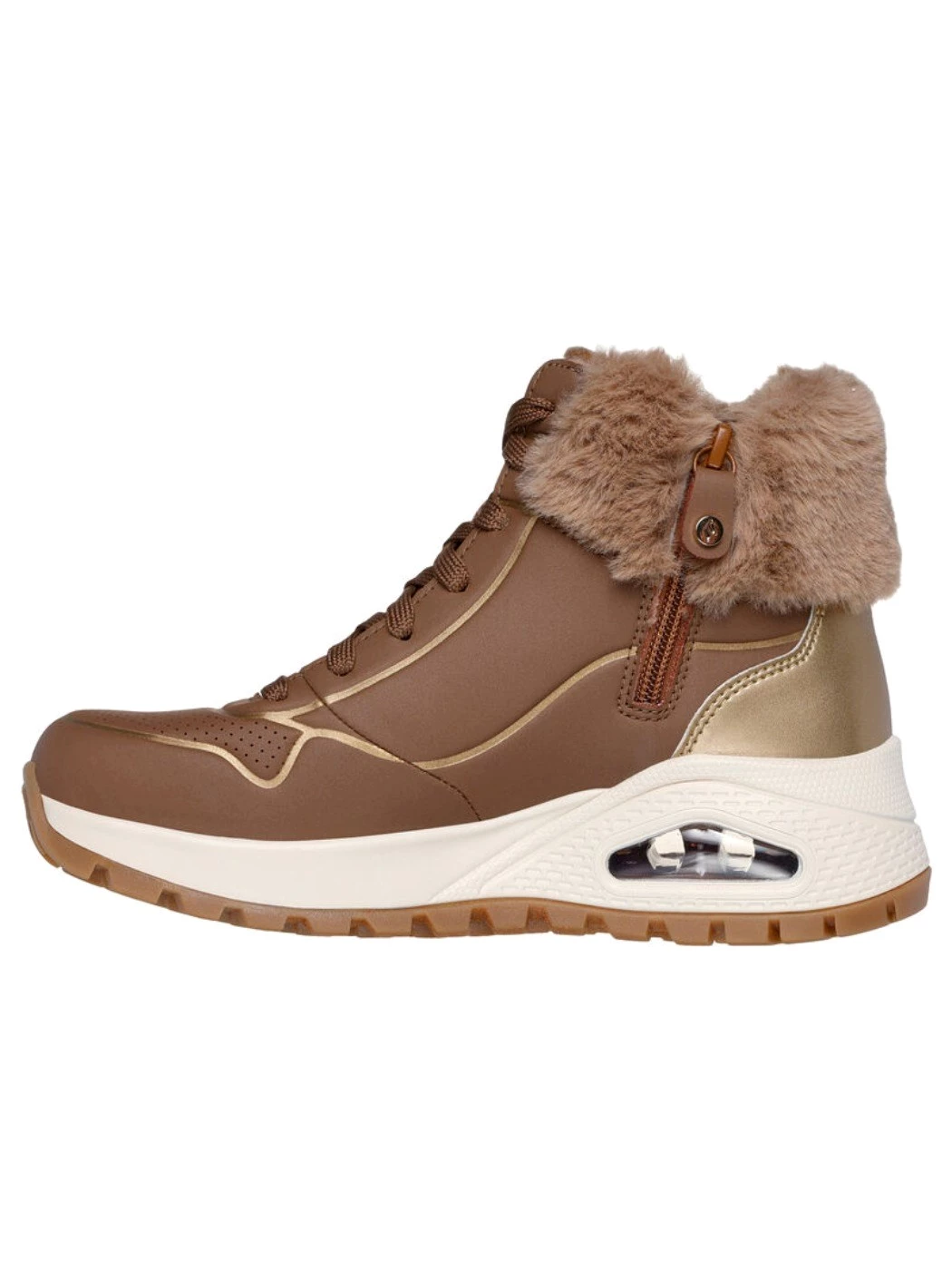 Lo stile perfetto per il freddo incontra il comfort sportivo in Skechers Uno Rugged- Fall Shimmer. Questo stivaletto sportivo con lacci e cerniera laterale presenta una tomaia in durabuck con finitura metallizzata sul tallone, collo e fodera in finta pelliccia, intersuola ammortizzata ad aria con tecnologia visibile Skech-Air® e soletta ammortizzata Skechers Air-Cooled Memory Foam®.