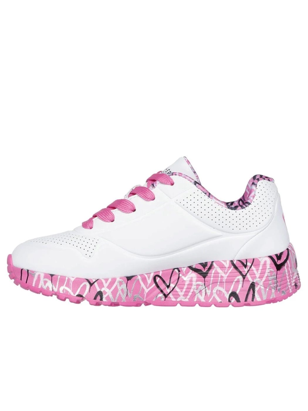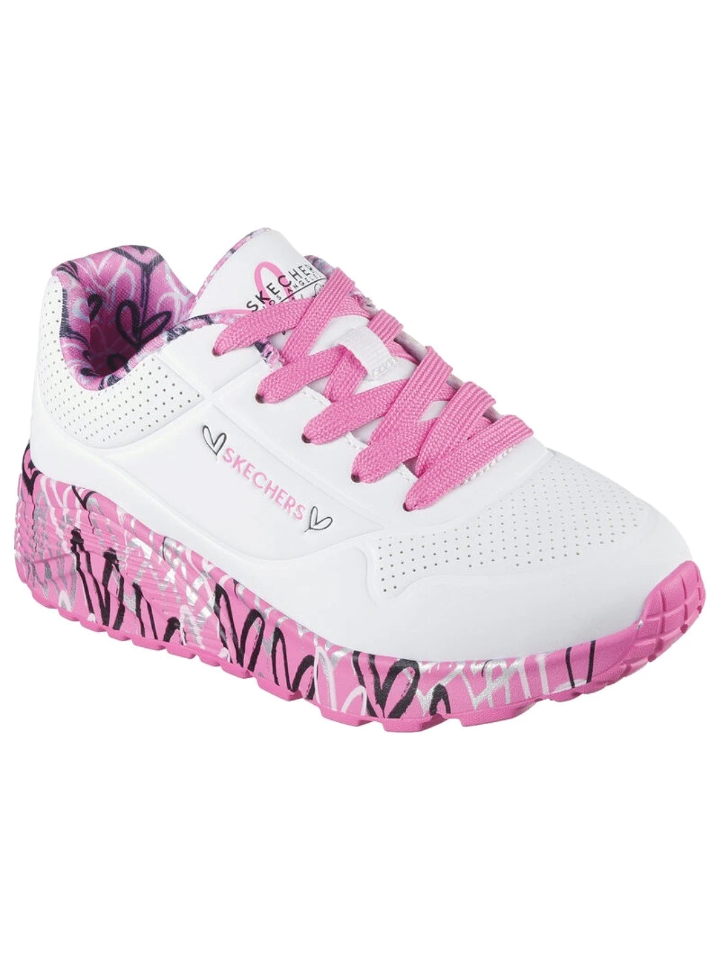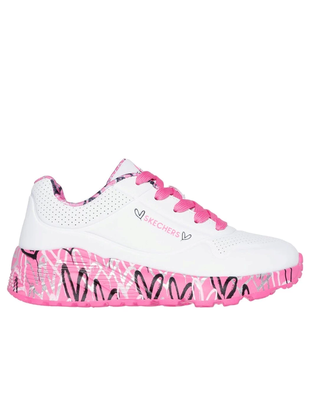 Internationally renowned muralist James Goldcrown brings his iconic #Lovewall heart designs to Skechers in this inspiring collaboration. Cute and colorful style meet in the Skechers x JGoldcrown: Skechers Street(TM) Uno Lite -B Lovely Luv. This lace-up fashion sneaker features the artist's signature heart design on the midsole, synthetic durabuck and perforated trimmed upper with a Skechers Air-Cooled Memory Foam® insole.