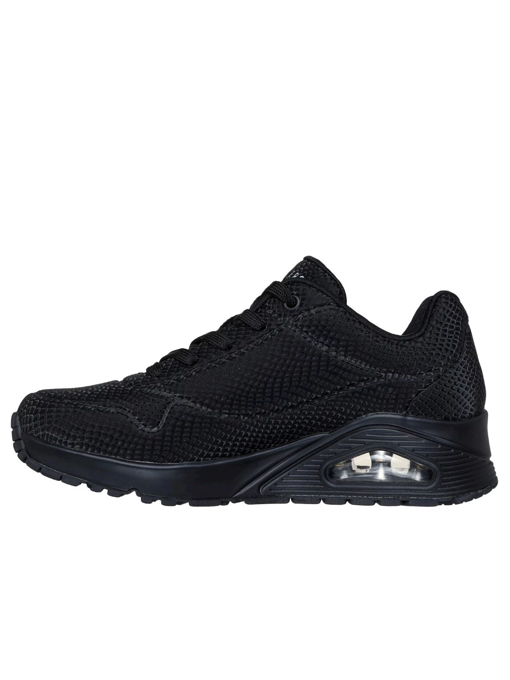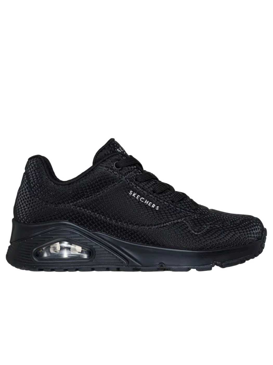 Fatti notare con lo stile grintoso e brillante di Skechers Street(TM) Uno - Shiny Scale. Questo modello fashion allacciato presenta una tomaia in durabuck con stampa effetto serpente riflettente, una soletta ammortizzata Skechers Air-Cooled Memory Foam(TM) e un'intersuola con ammortizzazione ad aria visibile Skech-Air®.