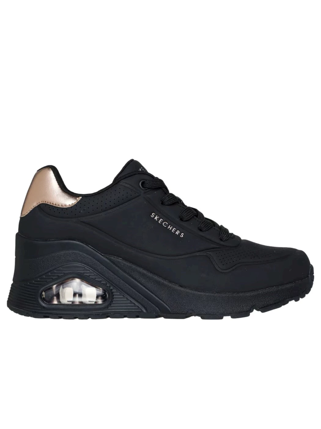 Rinnova il tuo guardaroba con un tocco di comfort indossando Skechers Street(TM) Uno Wedge - HI Steps. Questo modello fashion presenta una tomaia in durabuck con finiture in duraleather metallizzato, soletta Skechers Air-Cooled Memory Foam® e un'intersuola a zeppa platform con ammortizzazione ad aria visibile Skech-Air®.