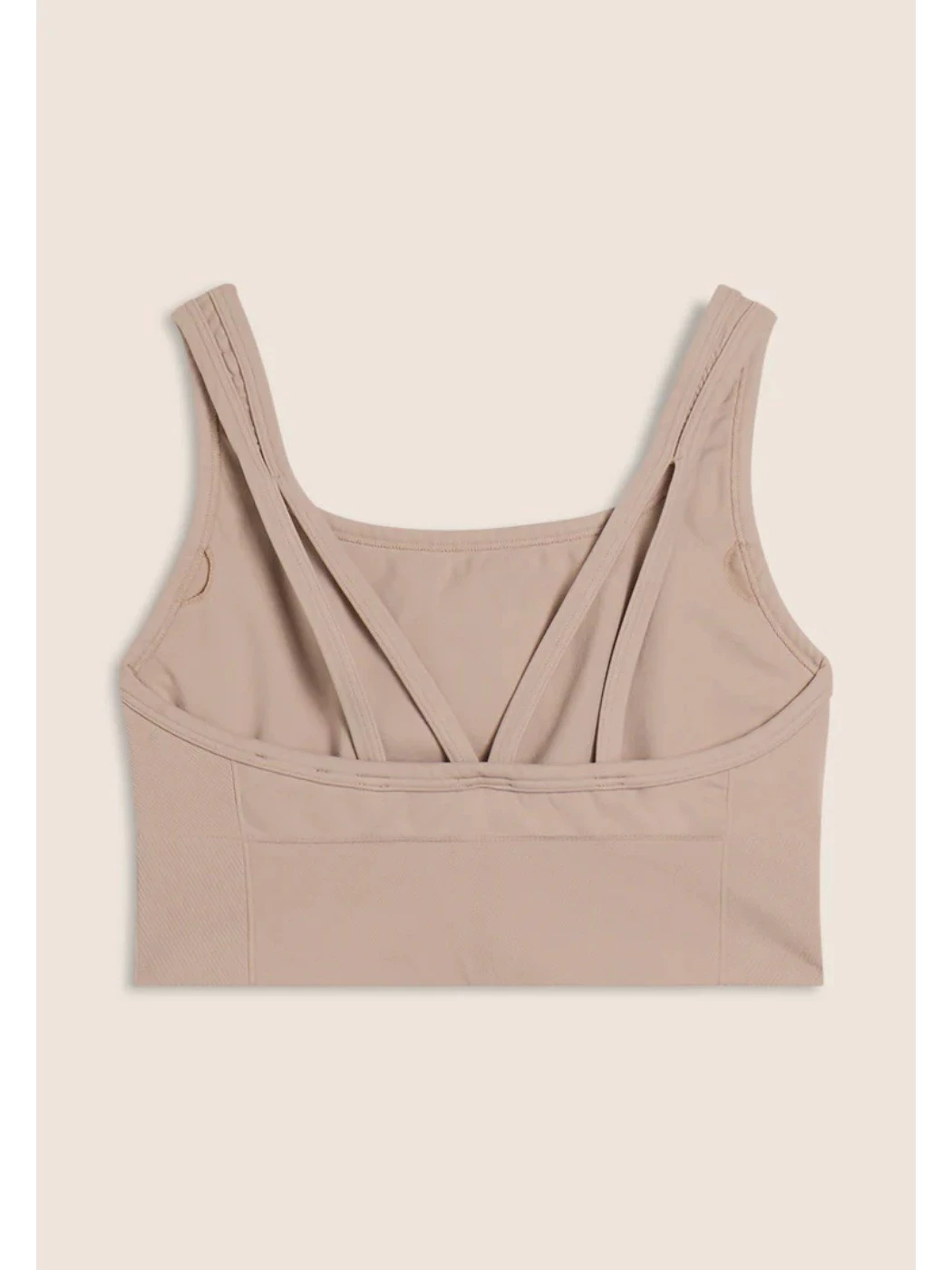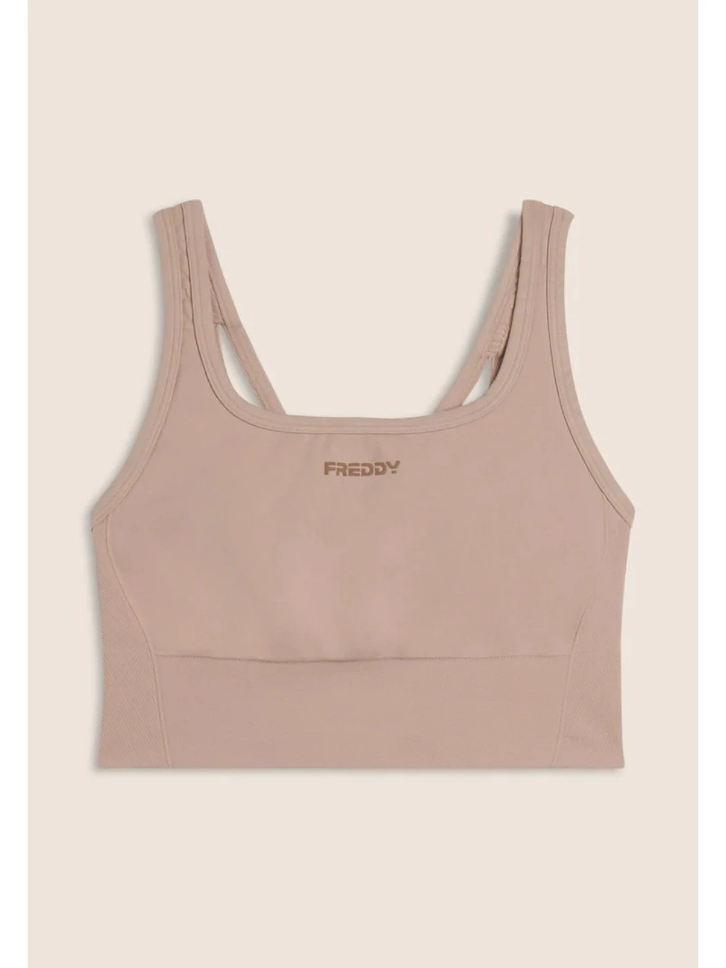 Reggiseno sportivo a supporto medio con coppe preformate removibili, ideale per il training quotidiano. Il taglio è studiato per offrire sostegno e stile: scollo tondo, spalline regular che si incrociano sul retro, e inserti laterali in tessuto con texture a spina di pesce. Il jersey nylon è traspirante e resistente.